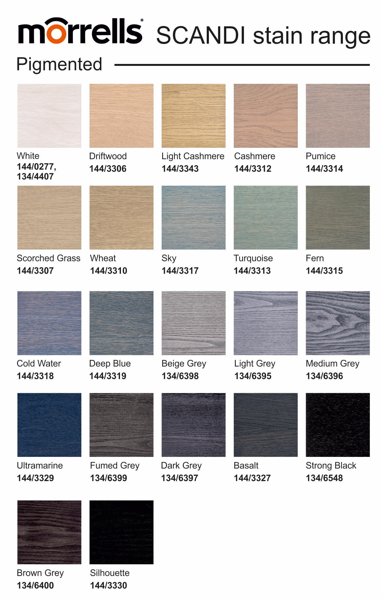 The Morrells range of SCANDI stains has been inspired by Nordic design and consists of classic wood shades and contemporary pigmented colours. All are lightfast and suitable for wooden substrates.